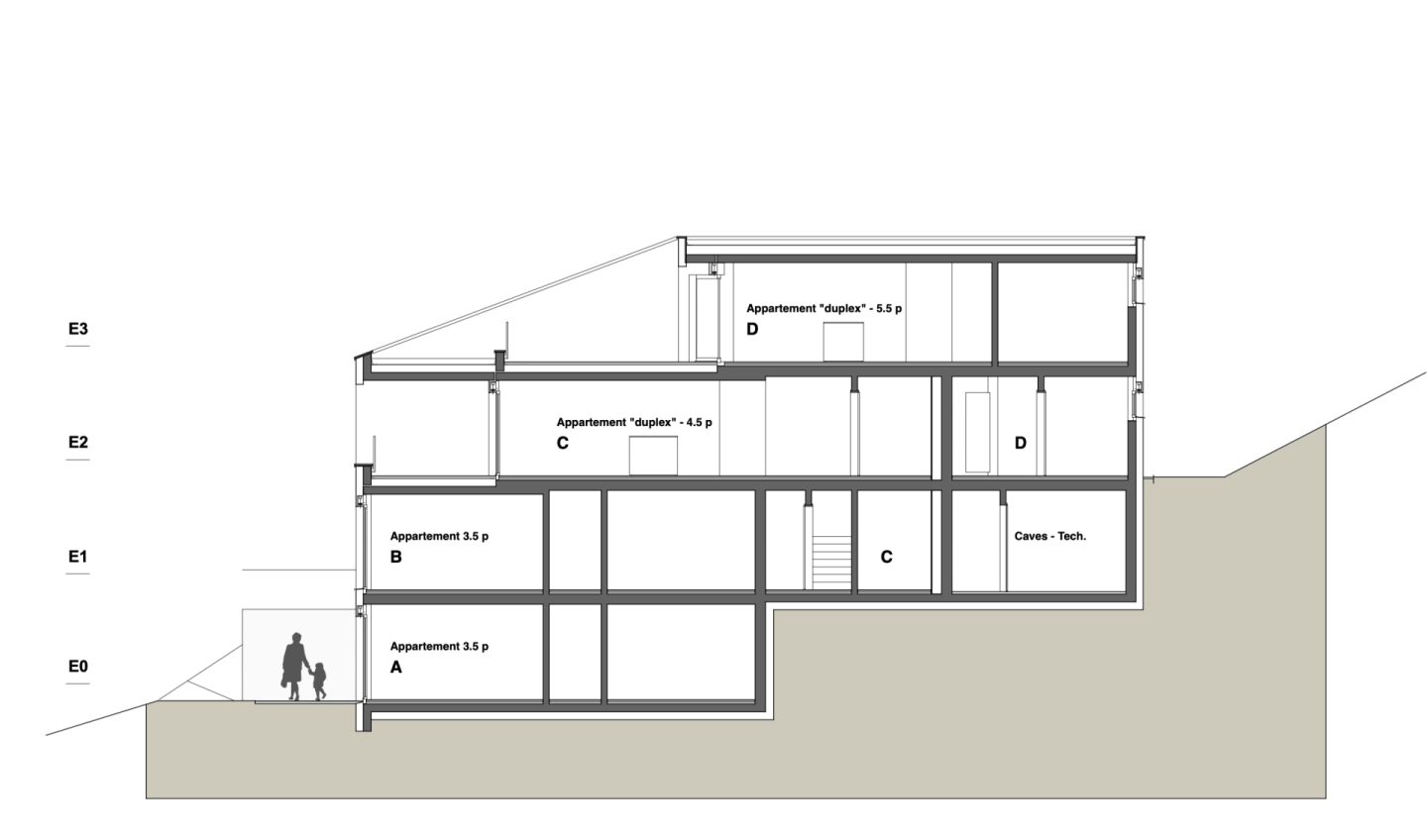 L’immeuble compte 4 appartements en PPE, répartis sur 4 niveaux. Il correspond aux critères de l’habitat moderne, notamment par une réalisation de premier ordre et le recours à des matériaux de haute performance. Il est à relever que chaque logement est au bénéfice d’une relation directe avec le terrain aménagé.